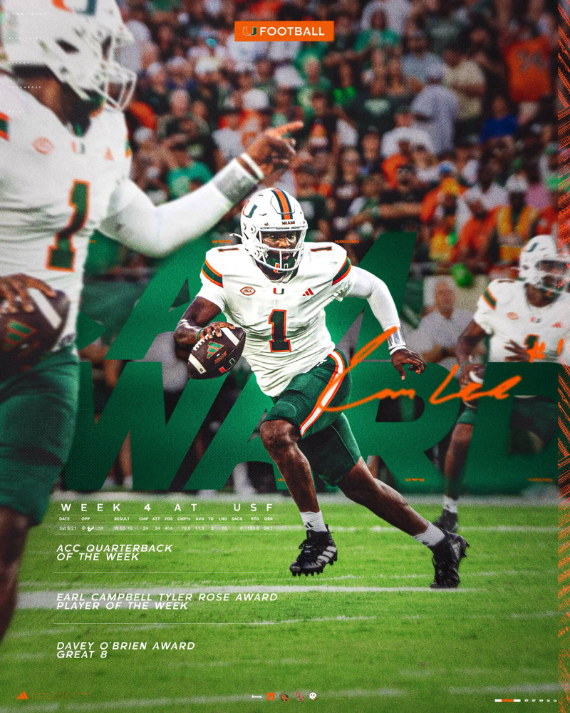 The 6-foot-2, 223-pound quarterback threw for 404 yards and three touchdowns, leading the Hurricanes to a 50-15 rout over USF.