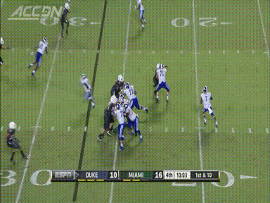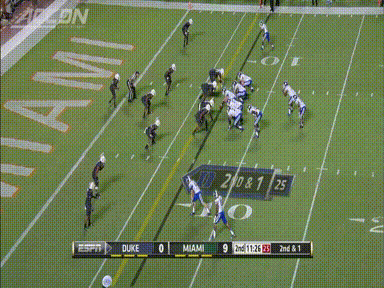 The Blue Devils fail to answer, going 3 and out. Raphael Kirby made a good play blowing up a screen pass before Crowder could do anything with it. In this instance, having a LB line up over a WR paid off. On Miami's next possession Kaaya goes play-action and throws an absolute bomb to a wide open Stacy Coley. He dropped what would have been a sure TD. Kaaya didn't care, and went to Walford on the next play for an 11 yard gain.