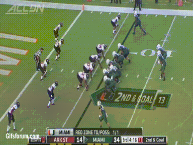UM deferred to the 2nd half and kicked off to ASU. 3 straight handoffs to backup RB Johnston White got them near midfield. It was looking like my worst nightmare for this game. Arkansas State had scored on the opening drive in each of their first 2 games. The pace was looking too fast for UM's defense and they seemed to be on their heels. Then the center snapped the ball before Fredi Knighten was ready for it and the ball sailed backwards for a 19 yard loss. ASU punted 2 plays later. After a short run by Duke, Kaaya went playaction and lofted a perfectly thrown bomb that hit Dorsett in stride. Dorsett streaked passed the secondary and coasted for the TD to put Miami up early.