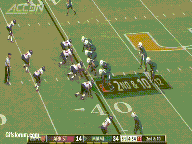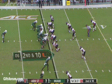 ASU picks up a first down when McKissic breaks a weak tackle attempt by Jamal Carter. They looked to have converted on 3rd and long again, but the awful ACC crew screwed Booker Mays out of an obvious catch, and the Red Wolves have to punt it back to UM. At this point Miami was a fluke snap and some questionable officiating from being down early. When Miami gets the ball back they are faced with a "Money Down" situation for the 1st time and they convert with a short pass to Braxton Berrios. On the next play Dorsett picks up 24 yards to move Miami into ASU territory.